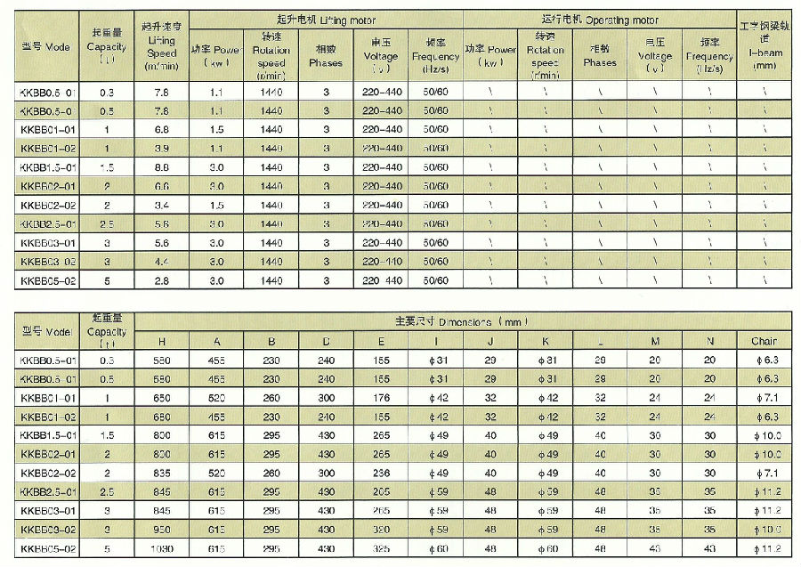 川崎KKBB環(huán)鏈電動(dòng)葫蘆參數(shù):