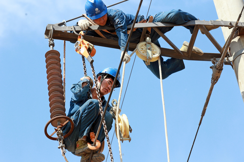 9月3日,河南湯陰縣城北環(huán)路110千伏湯菜線升級改造工程現(xiàn)場,湯陰縣電業(yè)局員工正在桿塔上作業(yè)。據(jù)悉,湯菜線投運(yùn)時(shí)間已久,加上近年來湯陰縣新投產(chǎn)企業(yè)越來越多,原有的設(shè)計(jì)參數(shù)已不能滿足現(xiàn)在的需求。為此,該局對湯菜線進(jìn)行升級改造,計(jì)劃新建110千伏線路3.32千米,組立鋼管塔31基。